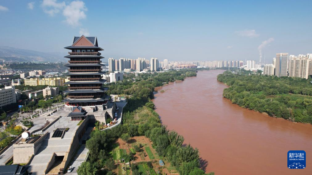 這是位于黃河蘭州段南岸的黃河樓(9月26日攝,無(wú)人機(jī)照片)。新華社記者陳斌攝