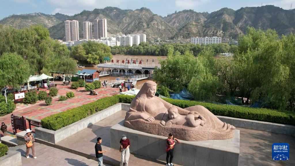 游客在位于黃河蘭州段南岸的黃河母親雕像參觀游覽(9月25日攝,無(wú)人機(jī)照片)。新華社記者陳斌攝