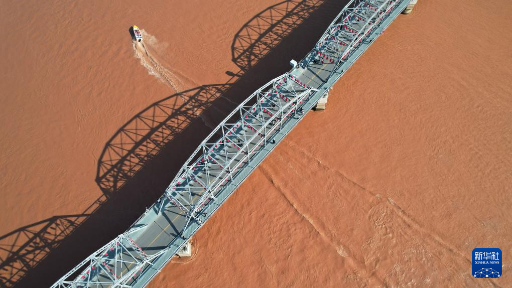 一艘快艇從黃河蘭州段中山橋下駛過(guò)(9月23日攝,無(wú)人機(jī)照片)。新華社記者陳斌攝