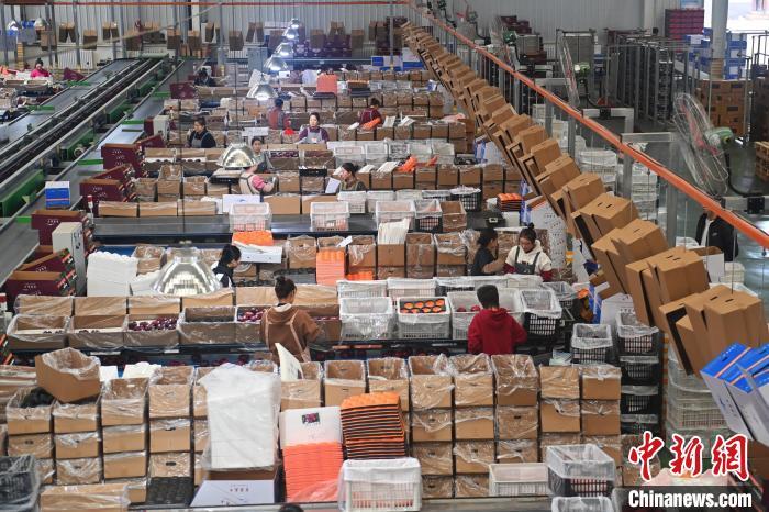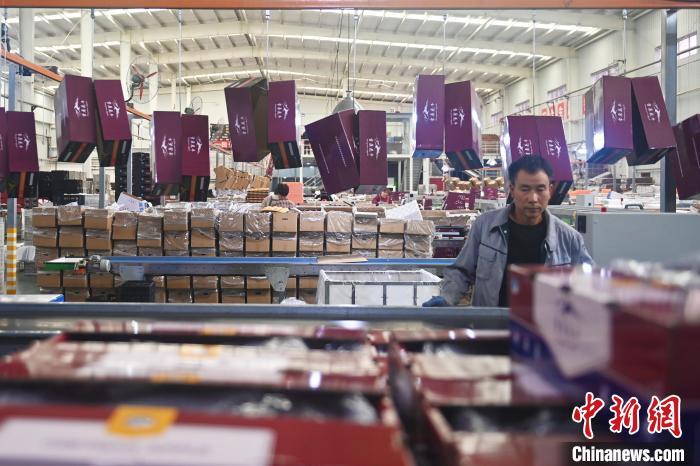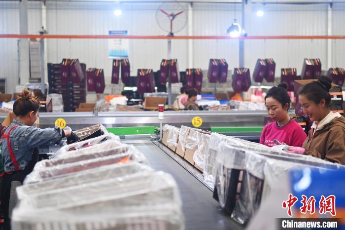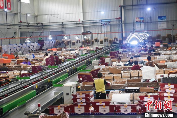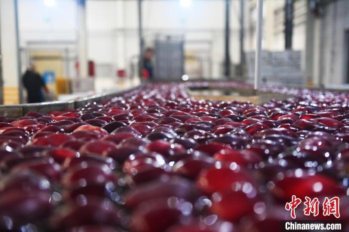 10月21日,在甘肅省天水市秦安縣雪原果品有限公司加工車間,蘋果自動化分揀線上工作人員進行分揀工作。該生產線每天能處理30噸蘋果,蘋果經(jīng)過設備水洗、烘干、稱重等環(huán)節(jié),進入不同等次的包裝線,工人們再對每顆蘋果進行復檢、貼標,分裝在不同規(guī)格的包裝箱中。甘肅秦安蘋果總面積61.37萬畝,產量86.8萬噸,產值55.6億元人民幣,先后從國內科研院所引進青砧、M26、ZH5等抗重茬蘋果矮化砧木6個,配合國家蘋果產業(yè)技術體系,引進長富2號、煙富6號、煙富8號、瑞香紅等蘋果新品種12個。中新社記者李亞龍攝