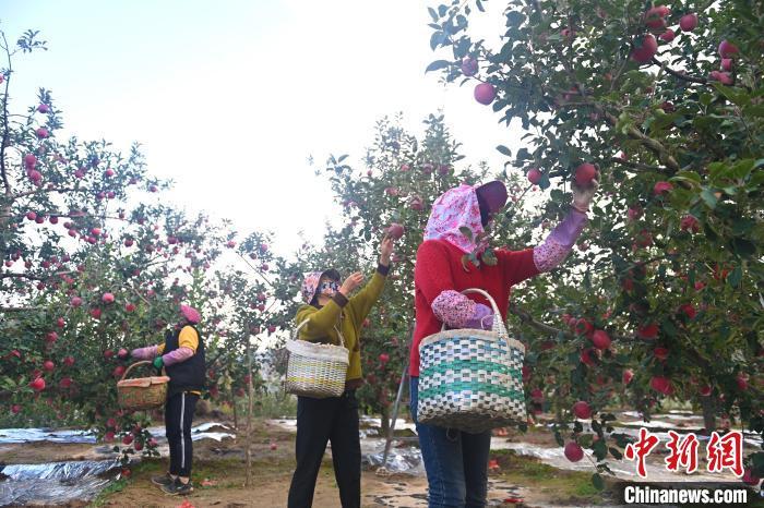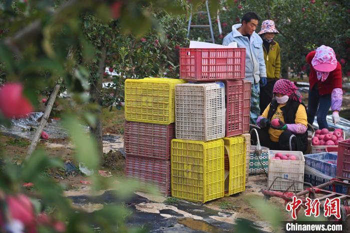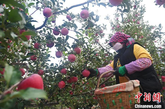 10月21日,在甘肅省天水市秦安縣一果園內,果農進行蘋果采收工作。中新社記者李亞龍攝