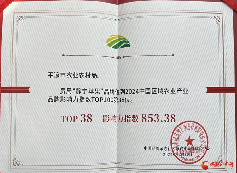 中國甘肅網(wǎng)12月25日訊(西北角·中國甘肅網(wǎng)記者 孫珩力 通訊員 胡繼萬)近日,由《中國品牌》雜志、中國品牌網(wǎng)主辦的2024區(qū)域農業(yè)品牌年度盛典在浙江金華舉行。會上,“靜寧蘋果”品牌榮登2024中國區(qū)域農業(yè)產(chǎn)業(yè)品牌影響力指數(shù)百強榜。