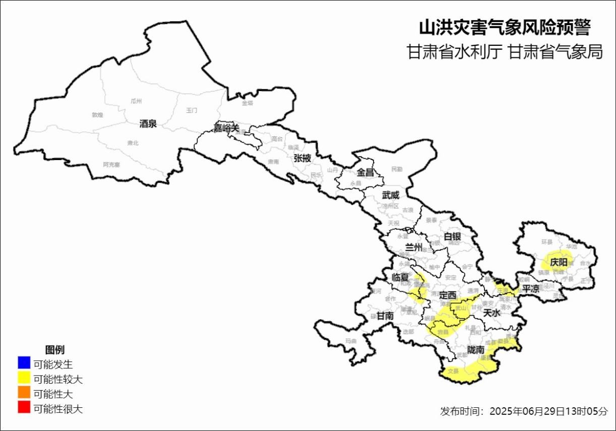 根據(jù)省氣象局《重大氣象信息專報(bào)》(2025年甘氣第10期),未來十天甘肅省多降水天氣,具有對(duì)流性強(qiáng)、小時(shí)雨強(qiáng)大、累積雨量大等特點(diǎn),洪水災(zāi)害風(fēng)險(xiǎn)高。6月29日13時(shí),省水利廳、省氣象局聯(lián)合發(fā)布山洪災(zāi)害氣象風(fēng)險(xiǎn)預(yù)警:預(yù)計(jì),6月29日14時(shí)至30日14時(shí),白銀市(景泰縣),武威市(古浪縣),定西市(臨洮縣、渭源縣、通渭縣、隴西縣、漳縣、岷縣),臨夏州(廣河縣、東鄉(xiāng)縣、康樂縣),甘南州(臨潭縣、卓尼縣、舟曲縣、迭部縣),天水市(秦安縣、甘谷縣、武山縣、張家川縣),隴南市(宕縣、禮縣、武都區(qū)、成縣、文縣、康縣、徽縣、兩當(dāng)縣),平?jīng)鍪校o寧縣、崆峒區(qū)、華亭市、莊浪縣),慶陽(yáng)市(西峰區(qū)、慶城縣、環(huán)縣、華池縣、鎮(zhèn)原縣)等地區(qū)發(fā)生山洪災(zāi)害可能性較大(黃色預(yù)警)。