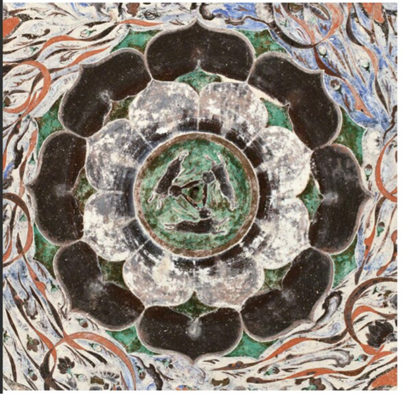 三兔共耳圖案、成熟的飛天造型、精美的紋飾圖案相互映襯,共同構(gòu)成了這幅令人嘆為觀止的藻井壁畫,受到人們的廣泛關(guān)注和喜愛。