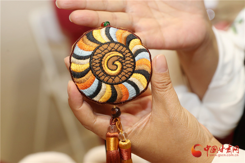 真正讓她想“給香包加點新東西”,是一次省博看展的觸動。站在馬家窯彩陶罐前,她盯著罐身流轉(zhuǎn)的旋渦紋出了神:“這么好看的紋路,繡在香包上多妙?”后來去敦煌,莫高窟里飛天的飄帶、藻井的繁復(fù)花紋更讓她挪不開腳?;貋淼穆飞?,一個念頭愈發(fā)清晰:要讓博物館里的文物“活”在香包里,讓老手藝沾染上“文化氣”。