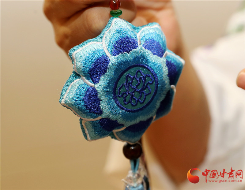 甘肅省博物館非遺集市的展臺前,包雨蕾的敦煌藻井香包一亮相就攥住了人的目光——青綠色絲線繞出的蓮瓣層層疊疊,中心飛天剪影隨腳步輕晃,清雅檀香混著花草香漫開來。這款光是飛天飄帶針法就琢磨了一個月的新作,藏著她的心思:用慶陽香包的針腳,把甘肅的千年文脈繡進當(dāng)下生活。