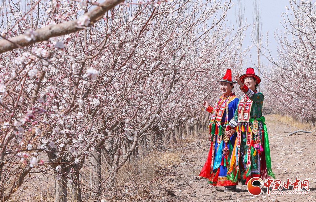 裕固族游客在千畝杏園種植基地里賞花