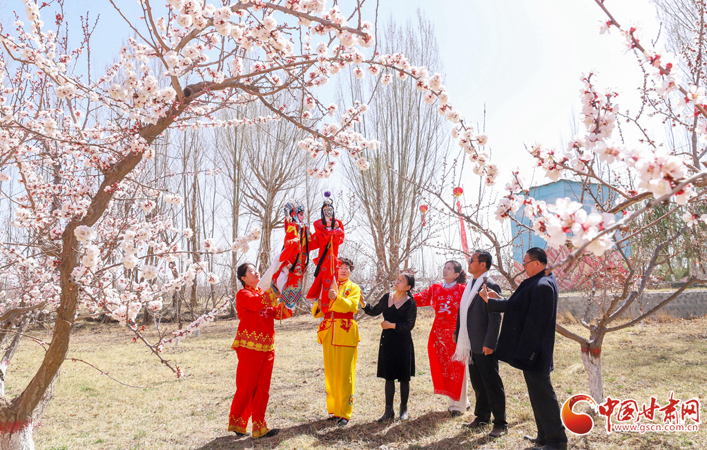 市民、游客在千畝杏園種植基地里觀賞非遺杖頭木偶戲