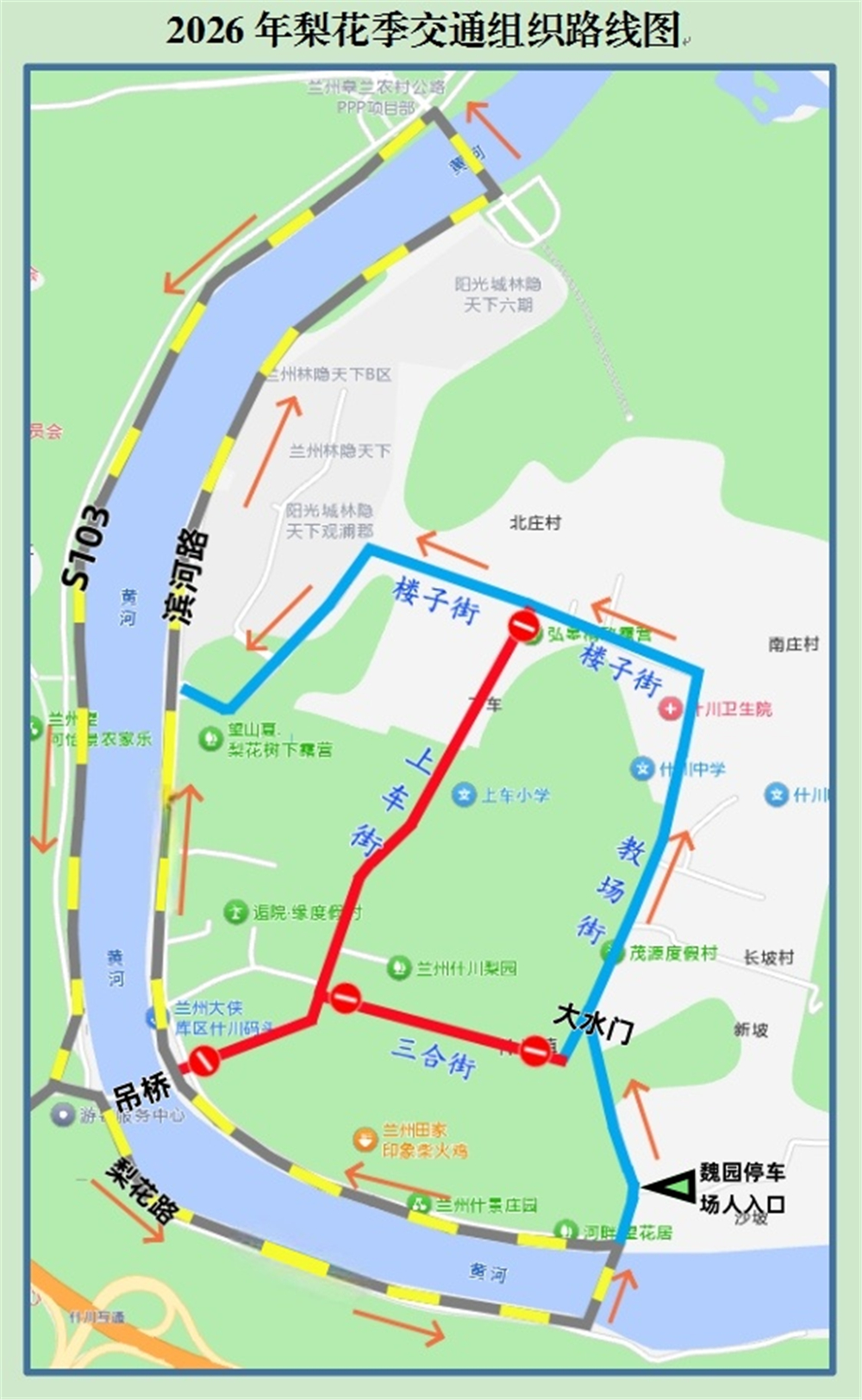 什川古梨園百年古梨樹枝繁葉茂,春日梨花滿枝、如雪似霞,每年梨花節(jié)都是市民游客春日打卡的熱門目的地。為應(yīng)對節(jié)日期間的車流高峰,皋蘭縣政府聯(lián)合縣公安局及各相關(guān)部門,制定了科學(xué)的交通組織方案,并繪制了2026年梨花季交通組織路線圖,明確了景區(qū)內(nèi)外循環(huán)通行規(guī)則與停車區(qū)域。
