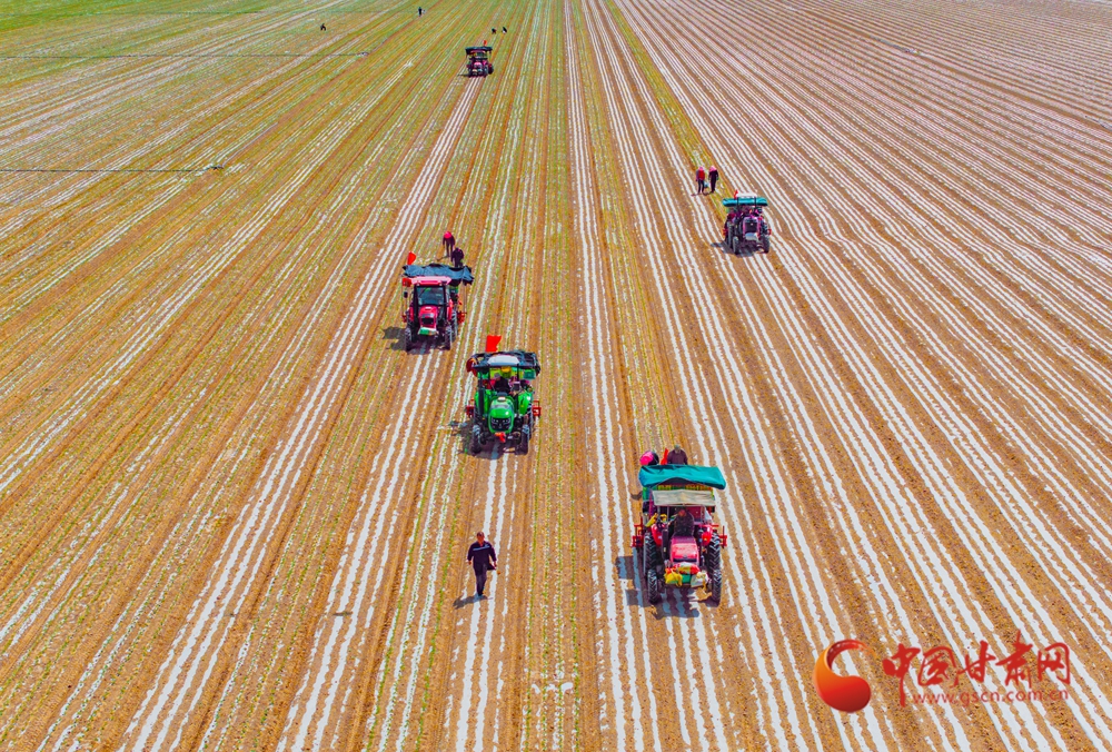 春日,走進(jìn)定西臨洮的田間地頭,一壟壟覆膜蜿蜒如銀色絲帶,在暖陽下泛起粼粼波光。洮河水畔,杏花初綻,村民們正彎腰點(diǎn)種、培土壓膜。新翻的泥土氣息混著花香彌漫田間。農(nóng)機(jī)轟鳴處,白膜與藍(lán)天相映,勾勒出黃土高原上最動人的春耕畫卷。