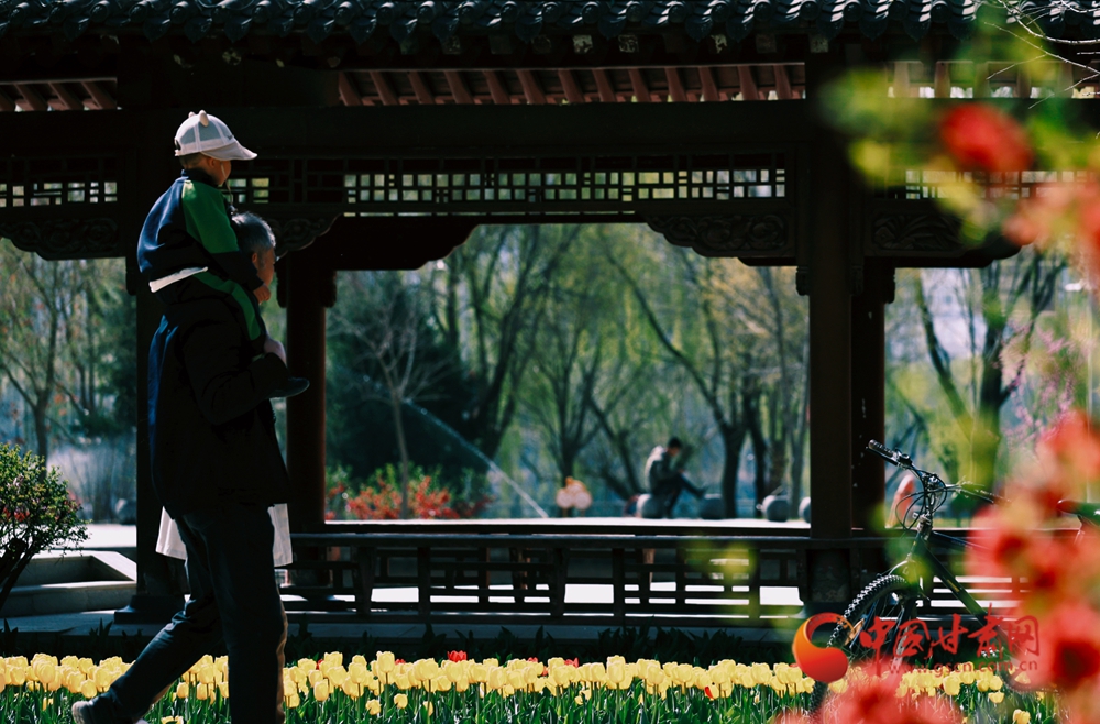 枝頭海棠熱烈潑灑,玉蘭凝脂般清潤綻放,白頭鵯啄食春光,灰椋鳥踏過青草,麻雀在暖陽下嬉鬧啼鳴——這是花鳥草木寫就的詩意。古亭飛檐下,晨練身影舒展安然;花影綽約間,孩童提桶追風(fēng),祖孫相伴徐行——這是尋常日子流淌的溫暖。