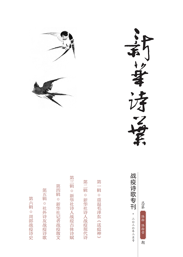《戰(zhàn)疫詩(shī)歌??肥窃谛氯A社原副社長(zhǎng)何東君,原社黨組成員、秘書(shū)長(zhǎng)張錦的共同倡議策劃和組織指揮下,在較短時(shí)間內(nèi)高效率、高質(zhì)量完成的。這本??襁_(dá)140多頁(yè),共由六大單元組成。其中,第一輯開(kāi)篇重溫毛澤東《送瘟神》,由何東君撰文回顧新中國(guó)戰(zhàn)勝血吸蟲(chóng)病的悲壯歷史,以期為今日抗擊疫情汲取戰(zhàn)天斗地的民族精神力量;第二、第三輯分別刊登新華社記者編輯們抗疫主題的現(xiàn)代詩(shī)和古體詩(shī),風(fēng)格或豪放雄渾,或沉郁含蓄;最后一輯是周郎戰(zhàn)疫詩(shī)史專輯,專門(mén)刊登新華社高級(jí)編輯周清印的180首原創(chuàng)抗疫題材詩(shī)詞,彰顯對(duì)中華詩(shī)史傳統(tǒng)基因的繼承創(chuàng)新。