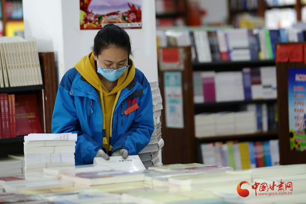 3月19日,在蘭州市西北書城,一名工作人員正在整理書籍。