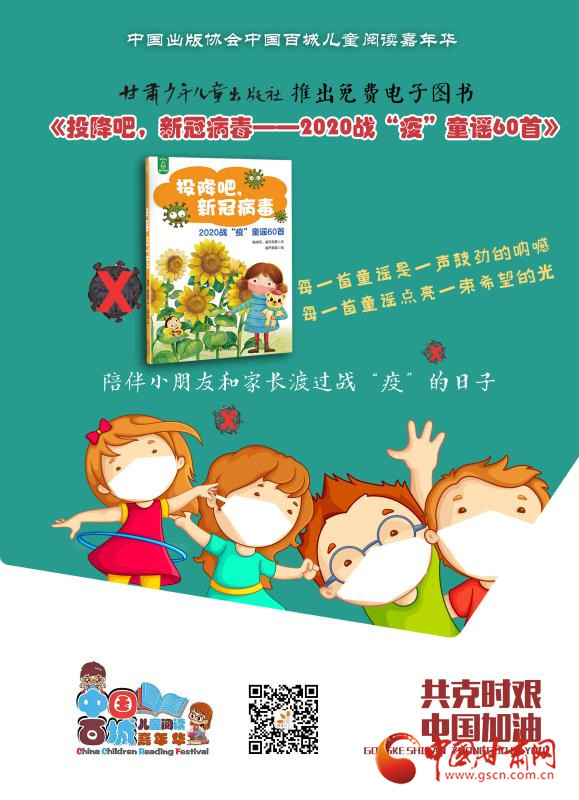 庚子之春,新冠肺炎疫情爆發(fā),全國(guó)人民奮力投身到這場(chǎng)疫情防控阻擊戰(zhàn)中,孩子們、兒童文學(xué)作家也紛紛創(chuàng)作了大量?jī)?yōu)秀的童謠。2月份,讀者出版集團(tuán)旗下甘肅少年兒童出版社(以下簡(jiǎn)稱:甘肅少兒社),策劃上線了免費(fèi)公益數(shù)字出版物《投降吧,新冠病毒——2020戰(zhàn)“疫”童謠60首》。書(shū)中收錄60首優(yōu)秀童謠作品,對(duì)兒童進(jìn)行防疫科普宣傳,以期提高兒童科學(xué)防護(hù)意識(shí)和戰(zhàn)勝病毒的信心。一首首童謠匯集起來(lái),架起了孩子和家長(zhǎng)共同抗疫的橋梁,也點(diǎn)亮了孩子們用稚嫩的眼光和思維認(rèn)識(shí)這場(chǎng)災(zāi)難的微光。