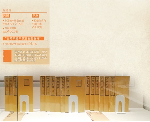 據(jù)聯(lián)合國教科文組織調(diào)查統(tǒng)計(jì),目前在全球47個(gè)國家和地區(qū)的200多座博物館中,記錄在案的中國文物有167萬件,而流散在海外民間的約是此數(shù)目的10倍,這些文物中間包括大量的古代典籍文獻(xiàn)。據(jù)研究,美國現(xiàn)存中國善本線裝古籍不少于70萬冊,古籍總數(shù)量接近400萬冊;歐洲粗略估算古籍有200萬冊;流入日本的中國古籍更多,“日本所藏中文古籍?dāng)?shù)據(jù)庫”中便可檢索到91萬條漢籍書目。國外各大公共圖書館、大學(xué)和研究機(jī)構(gòu)圖書館以及民間收藏的典籍文獻(xiàn)至今尚無系統(tǒng)的明確統(tǒng)計(jì)數(shù)據(jù)。