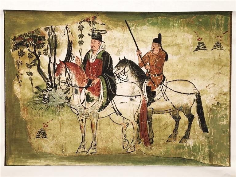 《兩位騎馬人》圖是大唐作品,現(xiàn)藏于法國吉美博物館。畫面上前面一匹紅鬃馬背上騎著一位男士,他身穿黑紅兩色長枹,佩冠。后面黑鬃馬上的男士好像是仆人,雙手持杖,戴冠穿長衫。畫面上人馬造型比例準(zhǔn)確到位,用筆自然流暢,駿馬強壯有力,人物體魄強悍。
