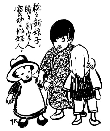 子愷先生藝術(shù)之獨(dú)特在另一方面——獨(dú)樹(shù)高標(biāo),表現(xiàn)童心童趣,抒情融入詼諧,展示了一種美學(xué)境界。此類經(jīng)典之作大多收集于《兒童相》。令人過(guò)目不忘者如畫(huà)孩子持兩蒲扇,一前一后,作騎馬狀,題曰“瞻瞻的腳踏車”;孩子將自己的鞋子墊于四腳圓凳之下,題曰“阿寶兩只腳,凳子四只腳”。于兒童經(jīng)驗(yàn)之局限寫(xiě)其心靈之天真,于不起眼的、平常人視之無(wú)所謂的現(xiàn)象中發(fā)現(xiàn)童心之美。還有一幅令人印象深刻,三個(gè)孩子,一女稍高,立于中,左側(cè)男孩,戴英式禮帽,甚大,右側(cè)女孩,頭蒙面布,題曰“軟軟新娘子,瞻瞻新官人,寶姊姊做媒人”。其事極不現(xiàn)實(shí)而孩子極慎重,于兒童顯示童心童趣,于畫(huà)則表現(xiàn)了先生的愛(ài)心和幽默。