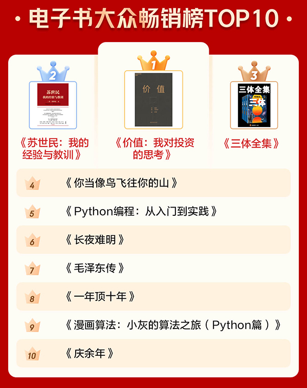 通過電子書暢銷榜TOP10和有聲暢銷榜TOP10可以看出,很多人愈發(fā)關注投資和管理等方面的內(nèi)容,也愈發(fā)注重個人學習?!秲r值:我對投資的思考》《蘇世民:我的經(jīng)驗與教訓》 分別位居電子書暢銷榜第一名和第二名?!吨袊?jīng)濟2020》《原則》進入有聲暢銷榜前十。此外,學習類圖書《Python編程:從入門到實踐》《漫畫算法:小灰的算法之旅(Python篇)》也上榜電子書暢銷榜前十。