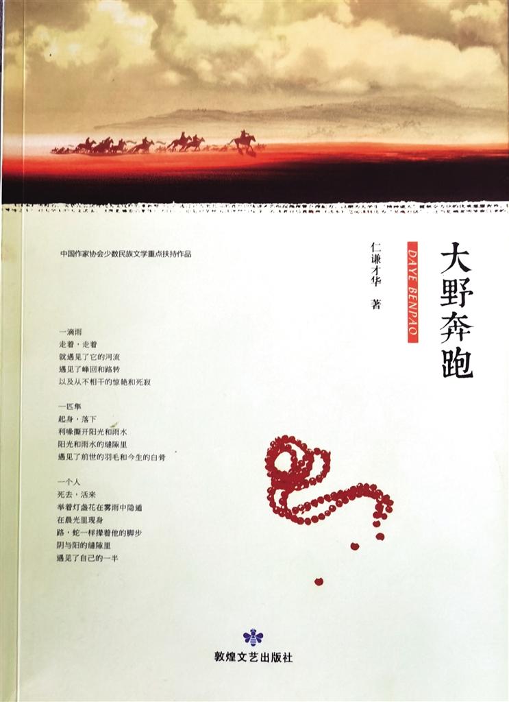詩歌集《大野奔跑》是仁謙才華近年來的傾心之作,該作品由敦煌文藝出版社出版發(fā)行。詩集由作家張存學(xué)作序,收錄了仁謙才華4年來發(fā)表在《詩刊》等刊物上130余首詩歌。張存學(xué)在序中這樣評價(jià):“語言,既是阻礙,也是抵達(dá)之路,這個(gè)緊張度也是考驗(yàn)一個(gè)寫作者的坎,這個(gè)坎過得好一些就能夠把握住詩抵達(dá)生命的本真,把握不好,就會在空泛的意象中游走。仁謙才華在這方面的蛻變,從他這本詩集能夠看出,他由早期的直抒胸意、向外張揚(yáng)變得安靜起來,變得從容而多思,也變得獨(dú)立而內(nèi)在……”