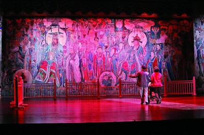 《永樂宮紀(jì)事》創(chuàng)造性地將蒲劇、歌劇、舞劇、話劇、音樂劇等多種藝術(shù)形式有機(jī)結(jié)合、融為一體,在充分利用地域文化元素的同時,還將珍貴的永樂宮壁畫與現(xiàn)代聲光電等舞臺技術(shù)有機(jī)結(jié)合,營造出絢麗多彩的舞臺效果。