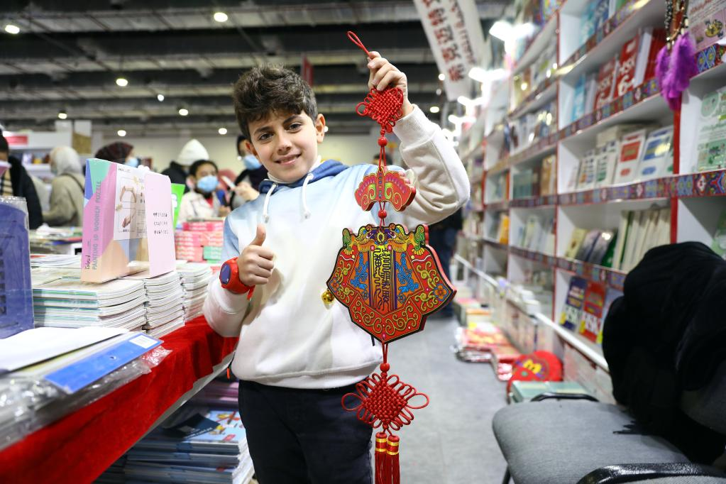 2月4日,在埃及開羅舉辦的開羅國(guó)際書展上,一名男孩在中國(guó)圖書展位展示春節(jié)裝飾。新華社發(fā)(艾哈邁德·戈馬攝)