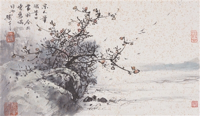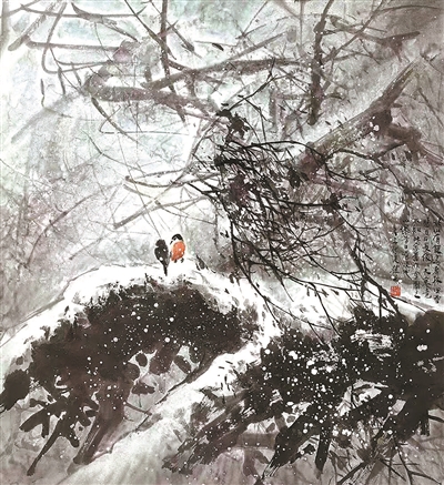 馮先生還和夫人在每年結(jié)婚紀(jì)念日時(shí)一起作畫,“我們?nèi)ツ赀^了綠寶石婚,結(jié)婚55周年。每到結(jié)婚紀(jì)念日,都是我們倆人畫一幅,畫一對小鳥。早在六七十年代最艱苦的時(shí)候就開始了,因?yàn)槲曳蛉艘彩钱嫯嫷?,我們那時(shí)一起畫了一對小鳥在風(fēng)雪里,那幅畫我現(xiàn)在還有。后來我們一直畫鳥,風(fēng)景在不斷地變化,這和我們對生活的感受有很大的關(guān)系。”