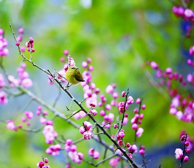 湖南省龍山縣,花兒開(kāi)放,引來(lái)小鳥(niǎo)“鬧春戲花”。新華社發(fā)