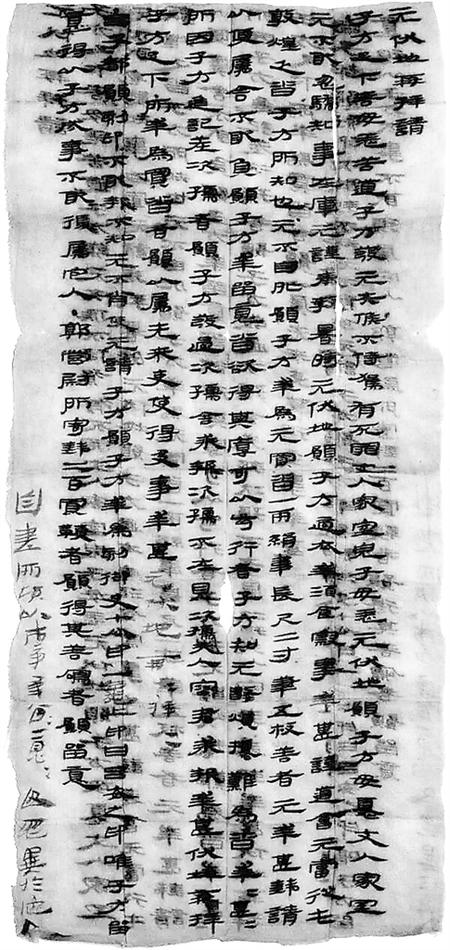 子方足下,善毋恙!苦道子方發(fā),元失候不侍駕,有死罪。丈人、家室、兒子毋恙,元伏地愿子方毋憂。丈人、家室元不敢忽驕,知事在庫,元謹(jǐn)奉教。暑時元伏地愿子方適衣、幸酒食、察事,幸甚!謹(jǐn)?shù)溃簳?dāng)從屯敦煌,乏沓,子方所知也。元不自外,愿子方幸為元買沓一兩,絹韋,長尺二寸;筆五枚,善者,元幸甚。錢請以便屬舍,不敢負。愿子方幸留意,沓欲得其厚、可以步行者。子方知元數(shù)煩擾,難為沓。幸甚幸甚!所因子方進記差次孺者,愿子方發(fā)過次孺舍,求報。次孺不在,見次孺夫人容君求報,幸甚,伏地再拜子方足下!所幸為買沓者,愿以屬先來吏,使得及事,幸甚。元伏地再拜再拜!
