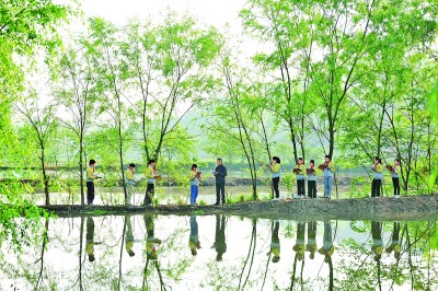 在江西萬(wàn)載縣馬步鄉(xiāng)洞口村,老師和學(xué)生們?cè)诹鴺?shù)下閱讀。鄧龍華攝/光明圖片