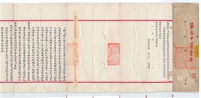 來(lái)自鎮(zhèn)江市圖書(shū)館的《封贈(zèng)文藻父母誥命》是清廷頒給張家口左翼正白旗滿洲四品銜驍騎校文藻父母的誥命,內(nèi)容為封賜文藻之父賡吉圖為昭武都尉,其母額哲特氏為恭人。這幅圣旨由黃、赤、紫三色錦織就,卷頭和卷尾分別織有漢、滿文“奉天誥命”4字,字兩旁有升龍和降龍盤(pán)繞紋樣。此誥命的制誥時(shí)間為光緒三十四年(1908年)十一月初九,當(dāng)時(shí)光緒帝已經(jīng)去世,宣統(tǒng)帝于此日即位。