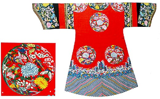 故宮藏大紅緙絲彩繪八團(tuán)梅蘭竹菊紋夾袍及紋樣 選自《遇見中國服飾藝術(shù)》
