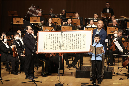 2月23日,北京,“前哲垂范 文津日新”——梁啟超誕辰150周年紀念配樂朗誦音樂沙龍在國家圖書館舉行。中國國家圖書館館長熊遠明(左)向梁啟超后人贈手書《少年中國說》。 蔣啟明/攝
