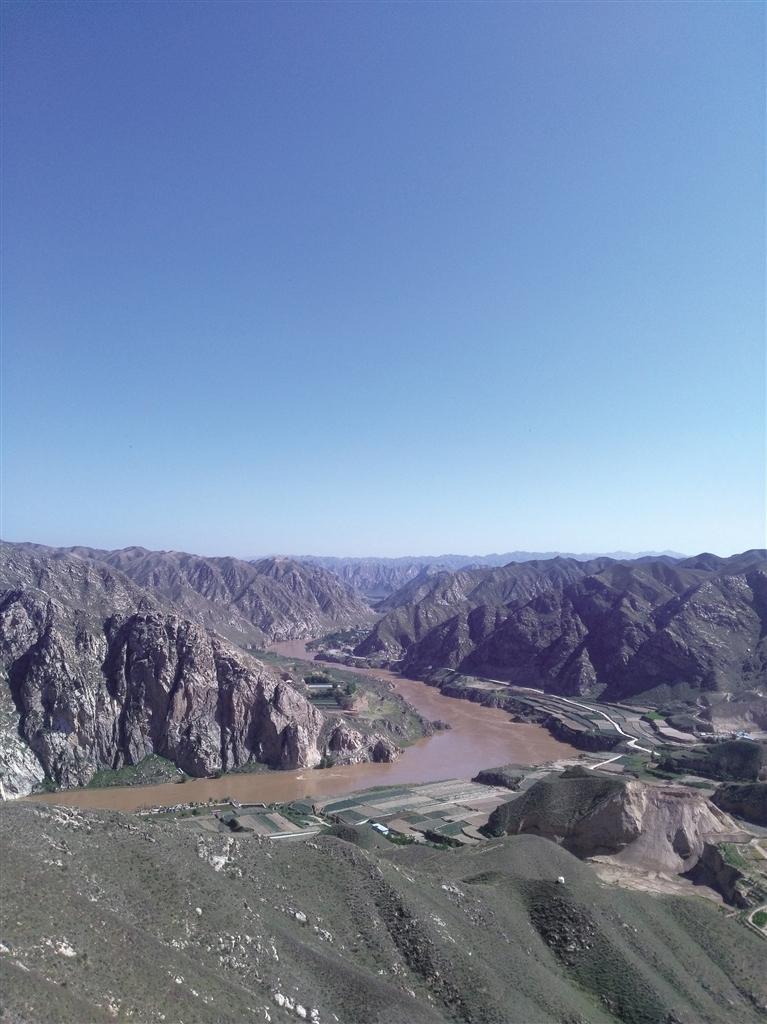 向西鳥(niǎo)瞰黃河,黃河幾乎直線撲面而來(lái),河水發(fā)黃,流淌緩慢。過(guò)去這里,河水湍急,老遠(yuǎn)就能聽(tīng)到咆哮之聲。由于20世紀(jì)末,在下游20公里處建了小峽水庫(kù),河水被抬升,河水流緩。黃河北面,依然是光禿禿的山巒。低頭看腳下的黃河,南岸的漢長(zhǎng)城遺址清晰可見(jiàn),旁邊有二三個(gè)人在農(nóng)田勞作。黃河流到此處,被腳下的九圪垯山迎面阻擋,折而向北,切開(kāi)重重山巒,帶著野性,蜿蜒而去,一點(diǎn)兒也不留戀桑園子峽,不留戀九圪垯山,不留戀滄桑的大地和歲月。