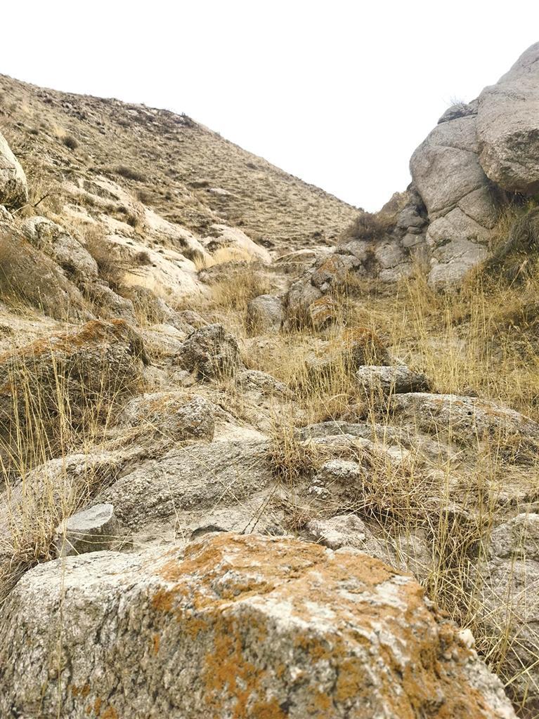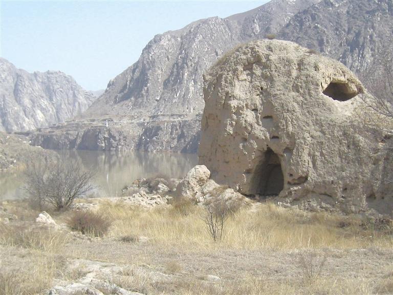 東坪向東300米,就是榆中境內(nèi)唯一遺留的一處漢長(zhǎng)城遺址,該遺址現(xiàn)只有一處墻墩,緊鄰黃河,圍長(zhǎng)40 余米,高約5米,無(wú)任何防護(hù)措施,墻壁上,有磚、石混雜其中,人工夯筑之痕清晰可辨。西側(cè)墻面上,還有人掏挖的小窯洞。高1.3米,深達(dá)50厘米。破壞嚴(yán)重。漢長(zhǎng)城遺址再向東200米,東金公路向右拐入七峴溝,向來(lái)紫堡川而去,而黃河則被東面的大山阻擋,無(wú)路可去,左拐北折而流向什川。此處就是著名的黃河大“幾”字灣的第一灣。第一灣的南岸,有十來(lái)戶人家,地名叫駱圈灣。由于地處古絲綢之路,曾建有駱駝圈和小型客棧供駱駝客隊(duì)歇腳而又在黃河拐彎處而得名,后來(lái),因諧音,叫羅泉灣。山腳下,有七八棵楊柳已吐綠。沿黃河,已無(wú)路可尋,就沿洪水沖的山溝上東山,還是無(wú)路,甚至沒(méi)有羊腸小道,巖石裸露,怪石嶙峋,坡陡難行。巖石層只有七八十米厚。此山的石頭,含有石英成分,石質(zhì)軟,無(wú)開(kāi)采利用價(jià)值。再往上,就是黃土層,直到山頂。由于干旱,整個(gè)山上,無(wú)一棵樹(shù)木,甚至連灌木都沒(méi)有。耐堿耐旱的駱駝蓬只發(fā)出二厘米的枝蔓,一些蒿草和矮草,也剛發(fā)芽,還有一些匍匐在地面的無(wú)名小草,卻已開(kāi)出了扁豆大小的艷麗的小花,有白色的和淡藍(lán)色的蝴蝶飛起飛落。爬到半山腰,太陽(yáng)已全面照曬,山坡雖陡峭,卻無(wú)陰涼可乘。渾身發(fā)熱,不得不解開(kāi)衣扣,緩慢前行。
