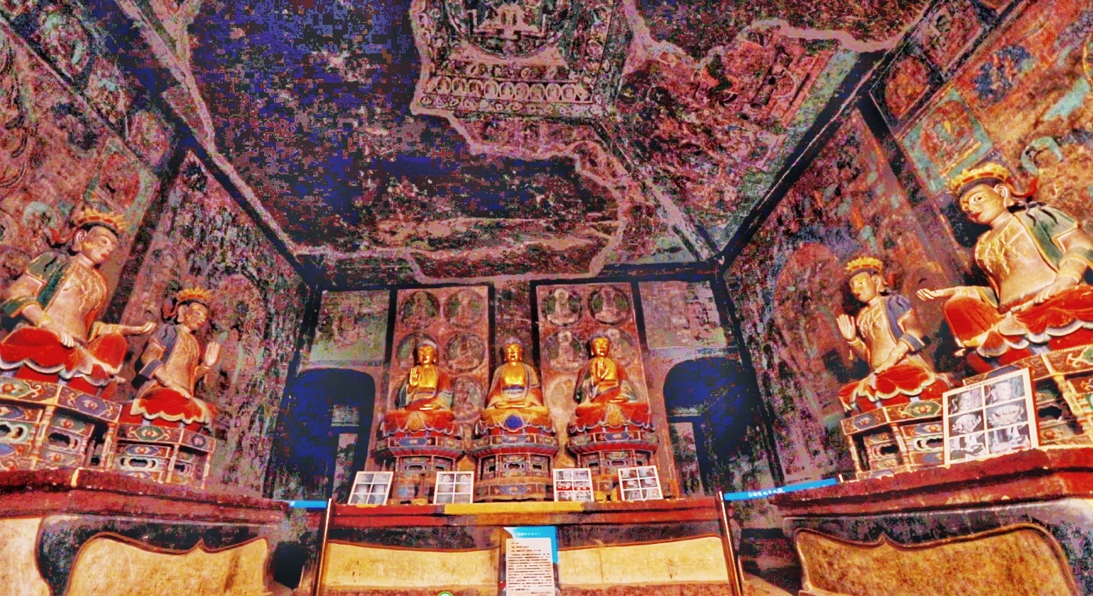 東千佛洞因地理位置相較于敦煌西千佛洞,故名東千佛洞,又因西夏7號窟前室東西壁對稱彩繪《接引佛祖》各一幅,故又名“接引寺”。初創(chuàng)于唐,五代、西夏、元、清各代增修,逐步形成較大規(guī)模的石窟群,現(xiàn)存23窟,以內(nèi)容豐富、技藝精湛的西夏壁畫稱絕于世,其密宗佛教壁畫填補了敦煌莫高窟壁畫藝術(shù)的空白。