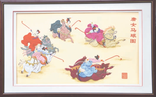 北京補繡代表作《唐女馬球圖》,色彩明艷,動感十足。