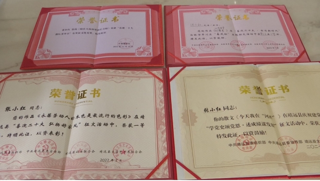 一分耕耘,一分收獲,機會總給有心人。如今,張小紅加入了靖遠縣作家協(xié)會、白銀市作家協(xié)會、白銀市文藝評論家協(xié)會成為了會員,也增選為靖遠縣政協(xié)委員。她的作品散見于《白銀文學》《烏蘭》等報刊雜志以及“靖遠作協(xié)”“隴上風情”“黃土情文學”等文學公眾號;部分作品榮獲靖遠縣建黨100周年“學黨史頌黨恩·述成績謀發(fā)展”征文二等獎,“喜迎二十大·教壇著華章”《未來導報》有獎征文優(yōu)秀獎等……