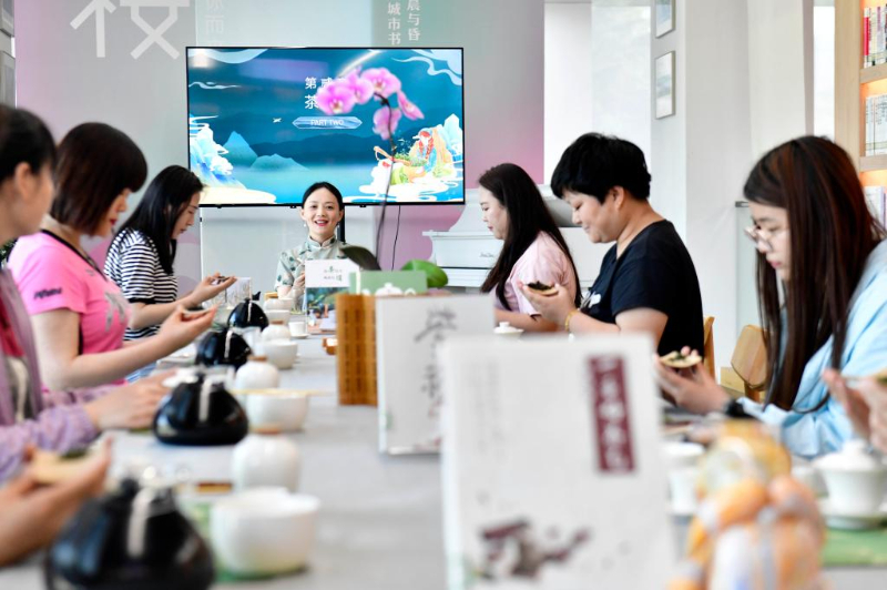 5月23日,市民在日照市東港區(qū)城市書房櫻花園館學(xué)習(xí)茶藝。