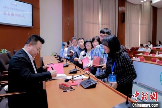 圖為邱華棟向部分參會(huì)代表進(jìn)行現(xiàn)場簽名贈(zèng)書?!?nèi)蒙古師范大學(xué)供圖