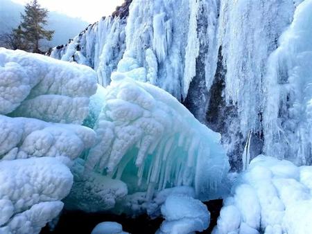 又一簾冰瀑,一個(gè)冰美人恬靜地睡著了,美麗的公主中了魔咒,魔說,解咒,冬日,來官鵝溝賞玩美景的王子從這簾冰瀑前走過時(shí),脫去了棉袍棉衣,用他炙熱的肉身撲向了冰瀑,冰融化了,公主活了。她用夜鶯般美妙的歌喉唱著以身相許的羌族情歌:“豆子開花頭對(duì)頭,燕子飛過繡花樓,妹是燈盞哥是油,一根稔子陪到頭”。王子和公主緊緊擁抱在一起的時(shí)候,終年積雪的擂鼓山,雪融冰化,雪水從高山草甸經(jīng)過,暗香浮動(dòng),十萬畝杜鵑花兒盛開了。雪水從茫茫林海經(jīng)過,水草豐美,珍禽異獸飲用著這雪山的瓊漿玉液,毛色發(fā)亮。雪水從山崖跌落到溝谷,在河灘??浚纬商烊桓鳟惖暮?,湖水清澈透明,隨湖底地貌高低呈不同顏色,藍(lán)天白云青山古樹映入湖中,天地渾然一體,天庭瑤池,最美也無非如此了。