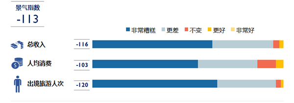 《報告》指出,受疫情影響,從業(yè)者對2020年上半年出境旅游市場的整體業(yè)績預(yù)期極為悲觀。與去年同期相比,景氣指數(shù)大跌113個指數(shù)點,至-113。同時,出境旅游人次、人均消費及總收入三項指標(biāo)的市場預(yù)期較2019年上半年均有大幅下滑,其中受疫情于全球蔓延的影響,從業(yè)者對出境旅游人次的預(yù)期負(fù)面性最高。