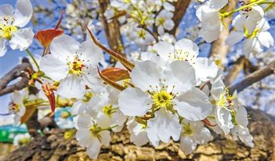 進入古梨園,看見古梨樹雖然沒有綠葉的襯托,但粗壯遒勁的枝干上開出簇簇潔白的梨花,樹皮的皴皺變得模糊,整個古樹也變得清新雅麗、溫婉可人起來,再看著樹下白墻青瓦的村屋,會讓人一下子忘掉冬天,這就是人們?yōu)槭裁磹墼诖禾旃涔爬鎴@的原因吧。