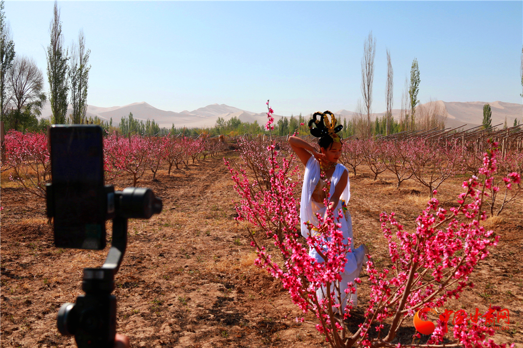 甘肅敦煌:鳴沙山下桃花朵朵開(圖)