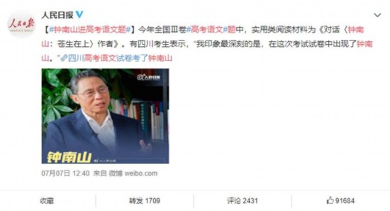 近日,“鐘南山進高考語文題”登上熱搜。據媒體報道,今年全國Ⅲ卷高考語文題中,實用類閱讀材料為《對話〈鐘南山:蒼生在上〉作者》。