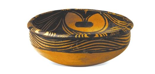 馬家窯文化馬家窯類型(距今約4800年),1966年蘭州市王保保城出土。這是一只工藝精湛,保存完好的彩陶盆,這只旋紋彩陶盆最大的特點是盆內(nèi)壁上繪的三組變體人面紋,同學們看出這組圖像人面嗎?看懂人面紋需要發(fā)揮想象力,總之,我們的先祖抽象表達的能力及想象力真令今人景仰!