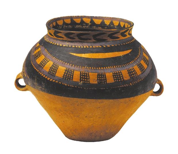 馬家窯文化半山類型(距今約 4500 年),廣河縣地巴坪出土。這是雙耳甕器型大氣貴重,施以紅、黑二彩,紅、黑彩交替使用,腹部繪多層連續(xù)垂弧紋和鋸齒紋,黑、紅彩交替使用,由三組分層連續(xù)的垂弧紋組成整體圖案,每層由兩層黑色帶紋和一層紅色帶紋組成,黑色帶紋上緣繪向上的鋸齒紋。整個圖案密集繁復,俯視猶如一朵盛開的鮮花,造型豐滿,色彩鮮艷。