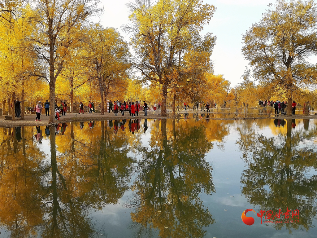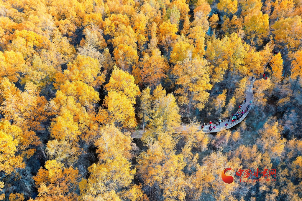 10月10日,在甘肅省酒泉市金塔沙漠胡楊林景區(qū),胡楊林在陽光的照耀下金黃燦爛,與湖水相映,令人流連忘返。(無人機(jī)照片)