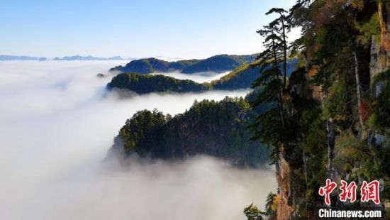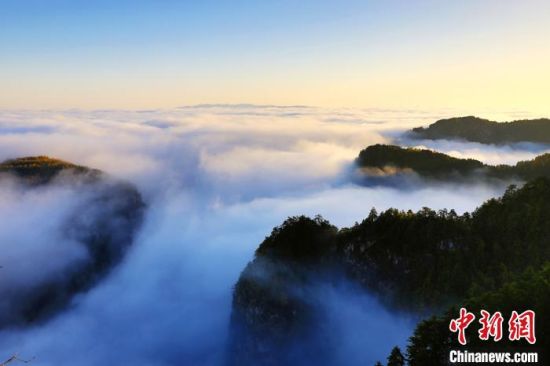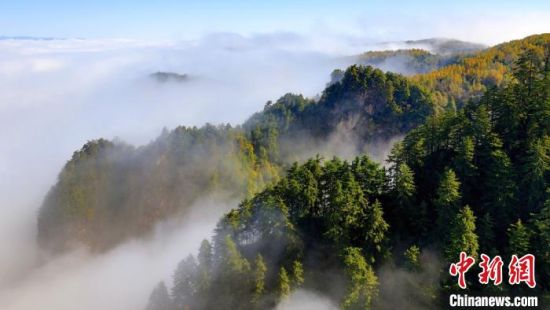 10月上旬,甘肅省定西市漳縣貴清山國(guó)家森林公園,朝陽在云層中若隱若現(xiàn),云遮霧繞的景象讓層巒疊嶂的山峰成為“云端村落”,仿若仙境。漳縣貴清山國(guó)家森林公園境內(nèi)原始森林遍布,森林、動(dòng)植物資源十分豐富,貴清山被譽(yù)為隴中的“小華山”,是生態(tài)旅游勝地。