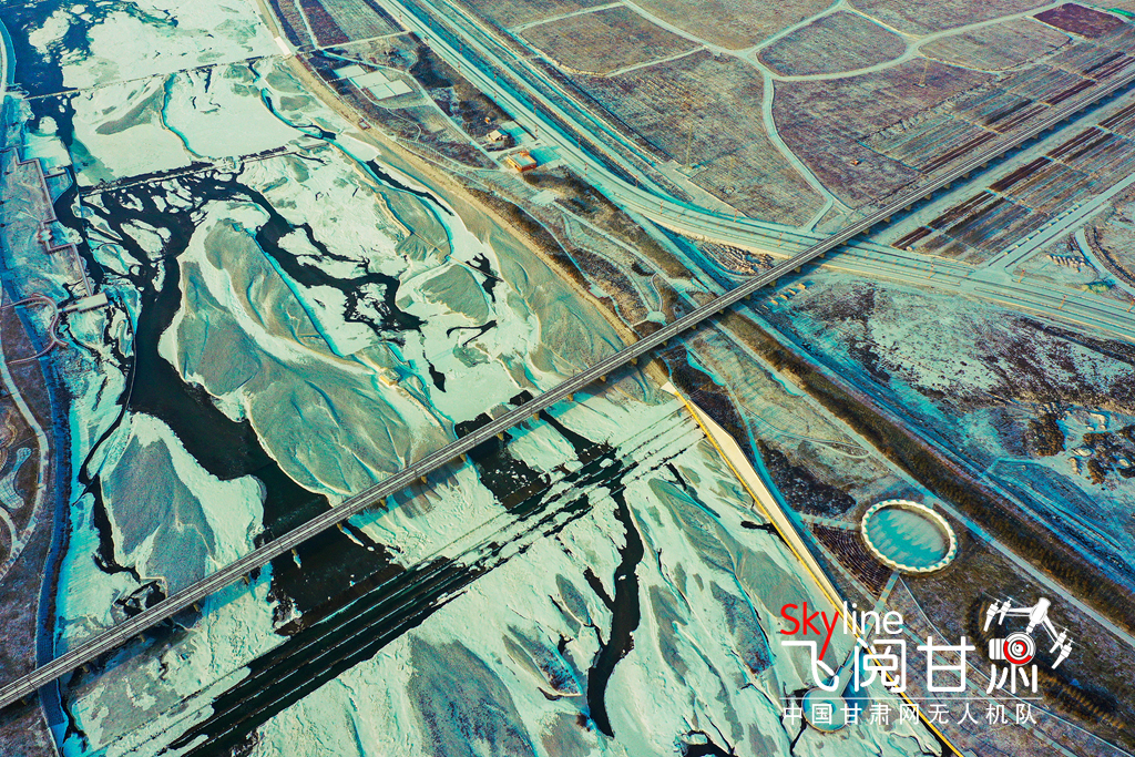 12月2日,雪霽天晴,冰封的黑河和漸凍的蘆水灣湖面上,皚皚白雪與裸露的水面形成丹青畫卷,別有一番趣味。(無人機照片)