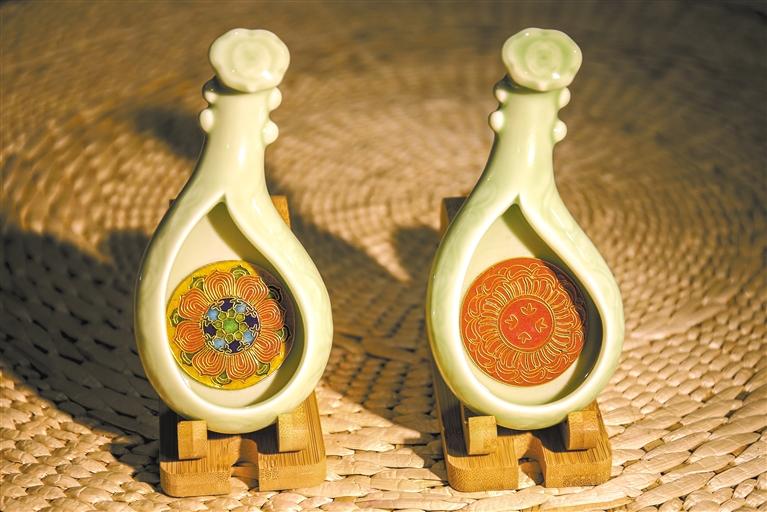 在李海明琺瑯?biāo)囆g(shù)館,記者看到工藝師們正在專注地進(jìn)行藝術(shù)創(chuàng)作。在展示架上,飛天琺瑯釉擺件、戲曲人物擺件、琺瑯墨匙、琺瑯茶墊等小文創(chuàng)作品令人目不暇接,就連手機(jī)殼、小鏡子這些小物件也因與琺瑯的融合變得新穎而獨(dú)特。